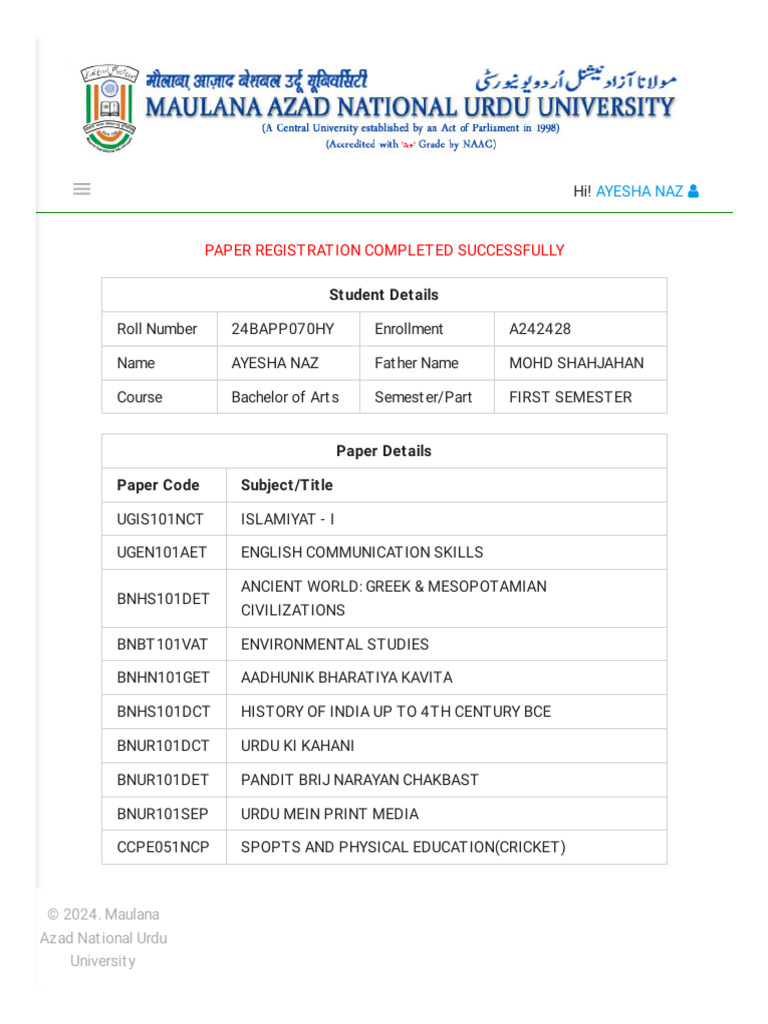 Ayesha Naz Course Registration PDF