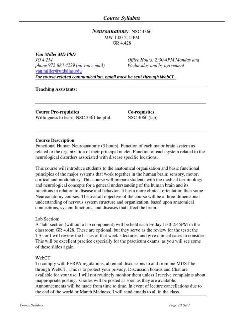 UT Dallas Syllabus For nsc4366.001.10s Taught by Van Miller (vxm077000