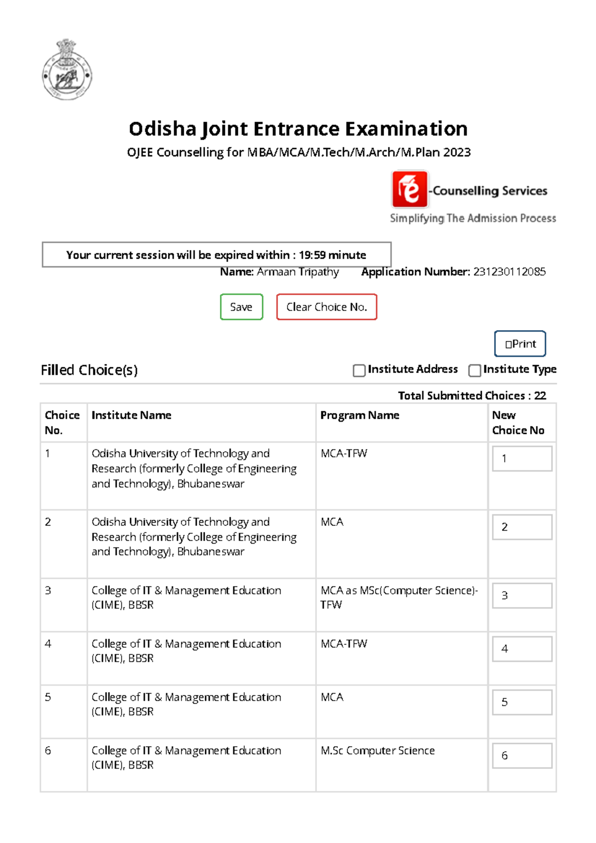 Admissions.nic course Filled Choice(s) Choice No. Institute Name