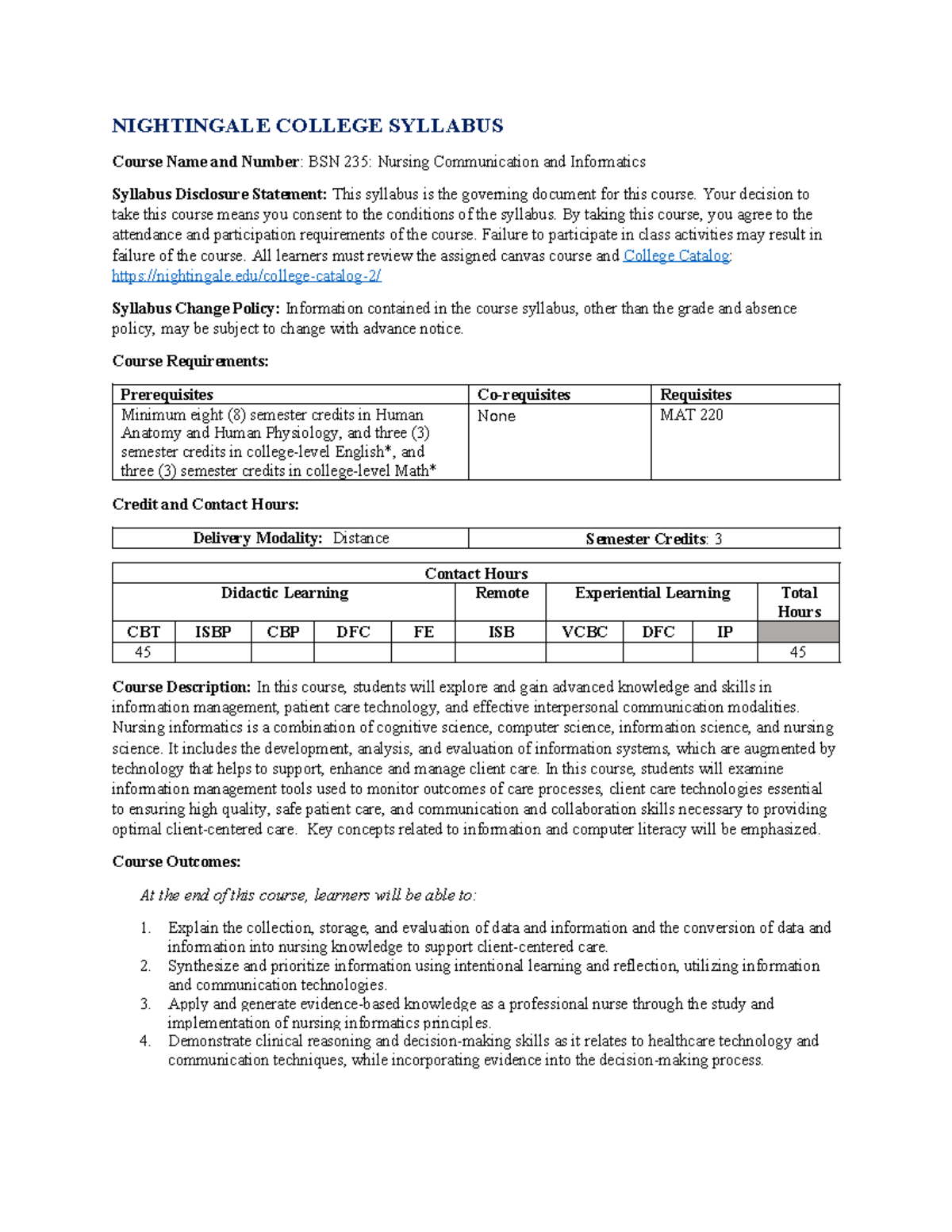BSN235 Howework informatics use NIGHTINGALE COLLEGE SYLLABUS