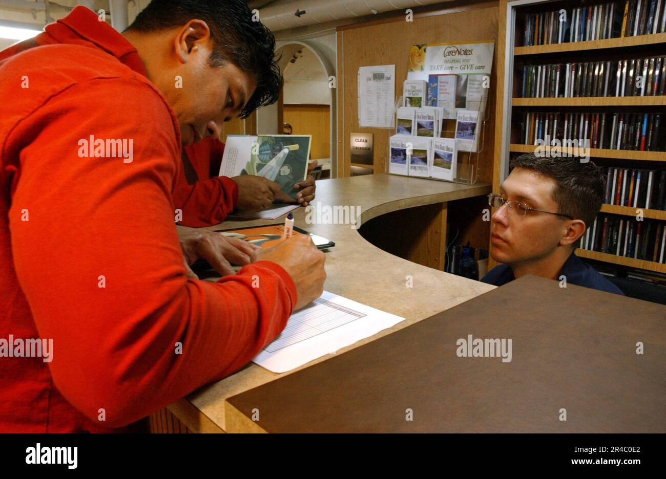 US Navy Master Chief Aviation Ordnanceman checks out a book from the