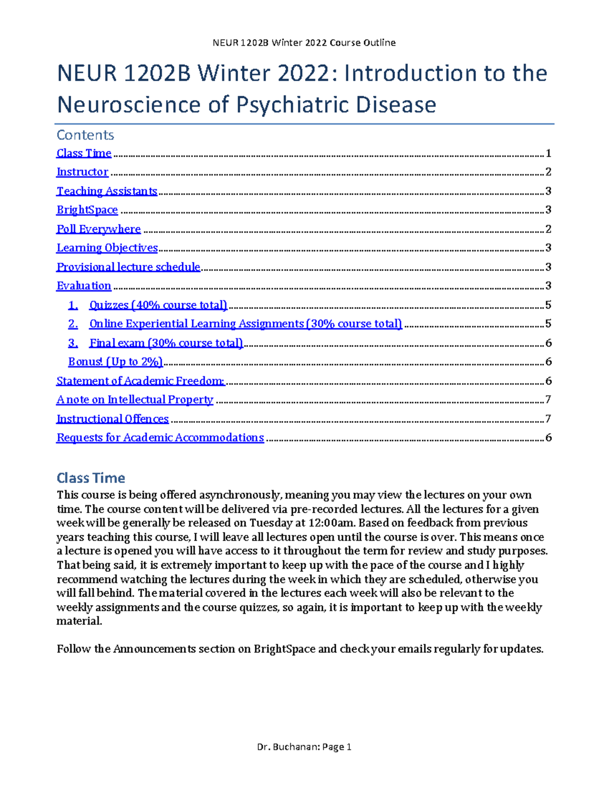 NEUR 1202B (NMH & Psychiatric diseases) Winter 2022 Course Outline DM