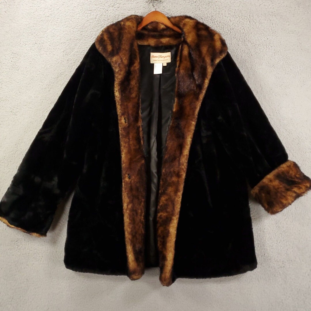 Vintage Norm Thompson Faux Fur Coat Womens Large Brown Black Cuffed