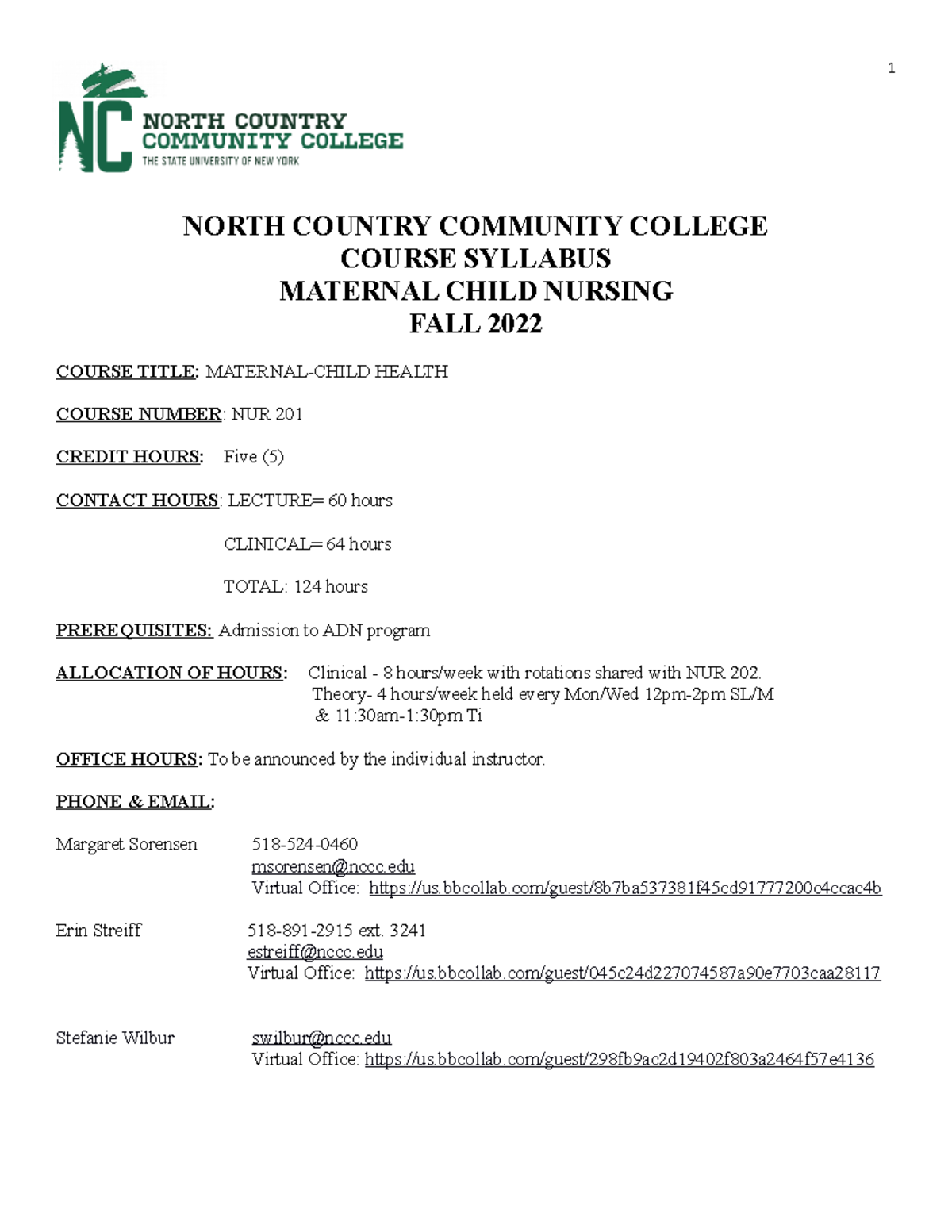 NURS 201 Syllabus FALL 2022 NORTH COUNTRY COMMUNITY COLLEGE COURSE