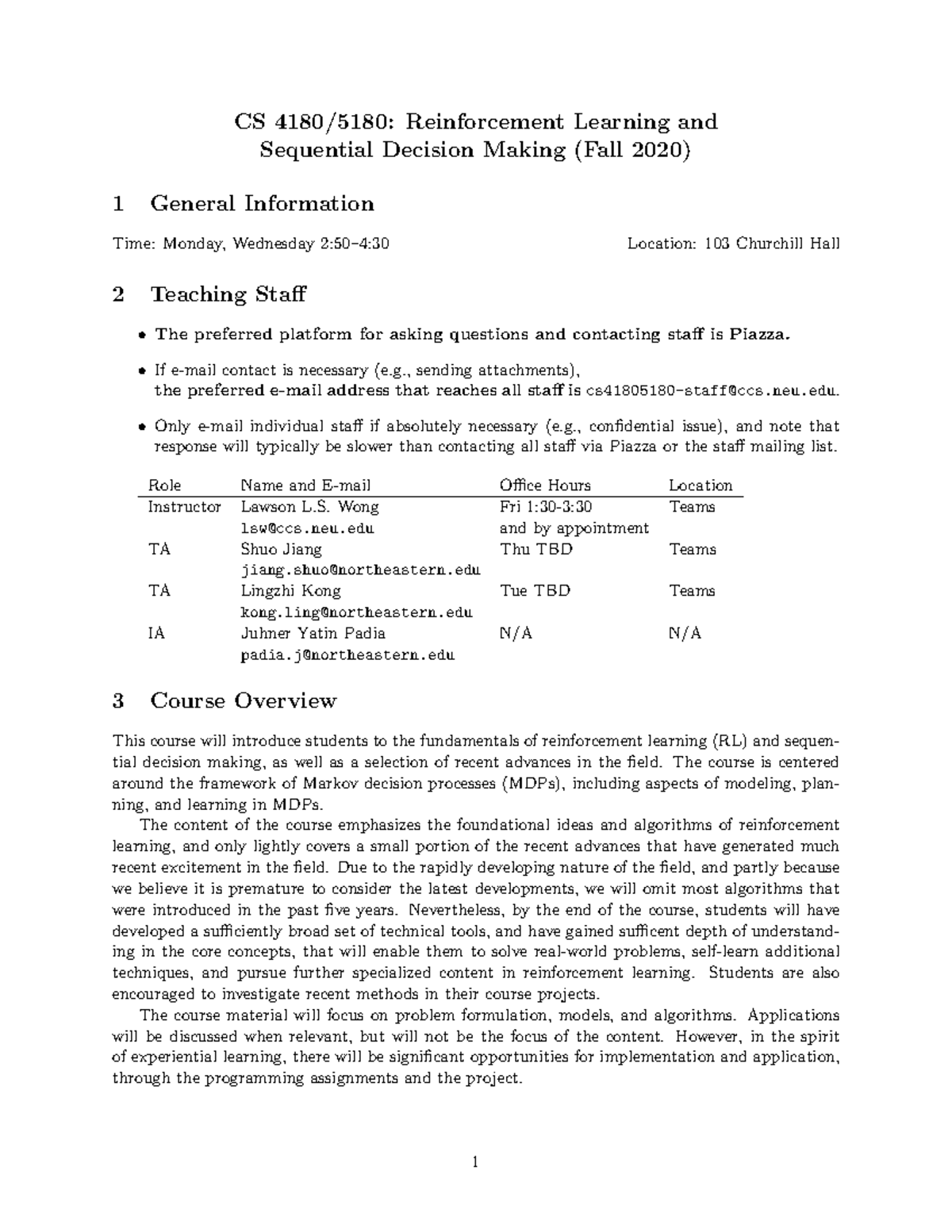 RL syllabus fall 2019 Northeastern university CS 7180 NU Studocu