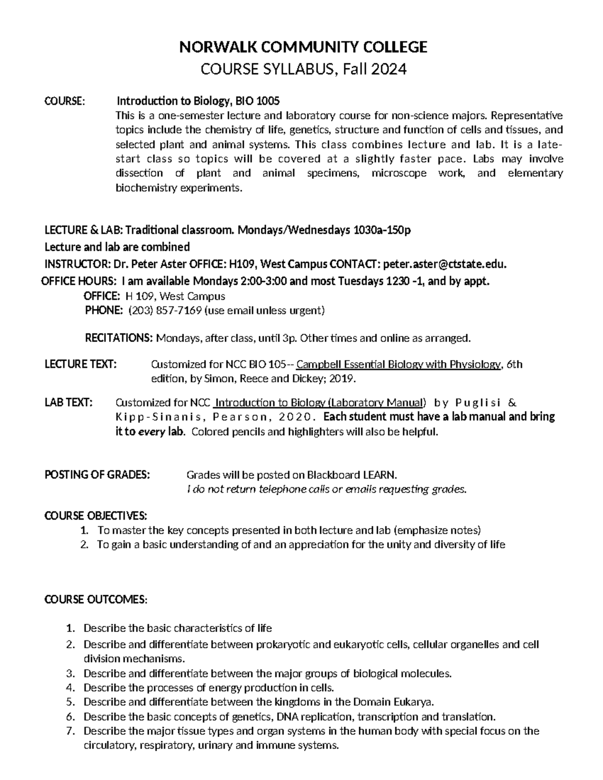 Bio 105 working copy 2024 syllabus Spr 19 NORWALK COMMUNITY COLLEGE