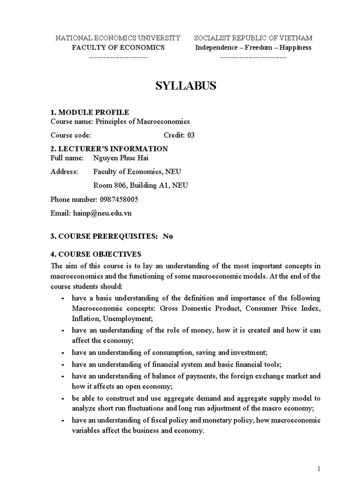 Principles of Macroeconomics syllabus Macroeconomics Textbook