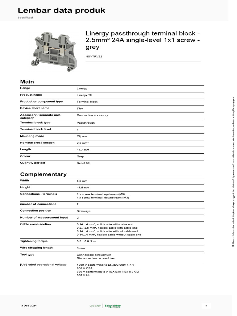 Jual Terminal Block 2.5mm² 24A singlelevel 1x1 screw NSYTRV22 1