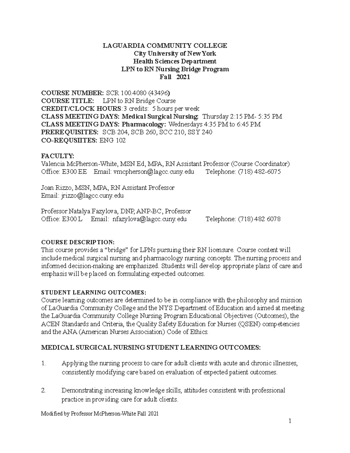 SCR 100 RN Bridge Course Syllabus Fall 2022 LAGUARDIA COMMUNITY