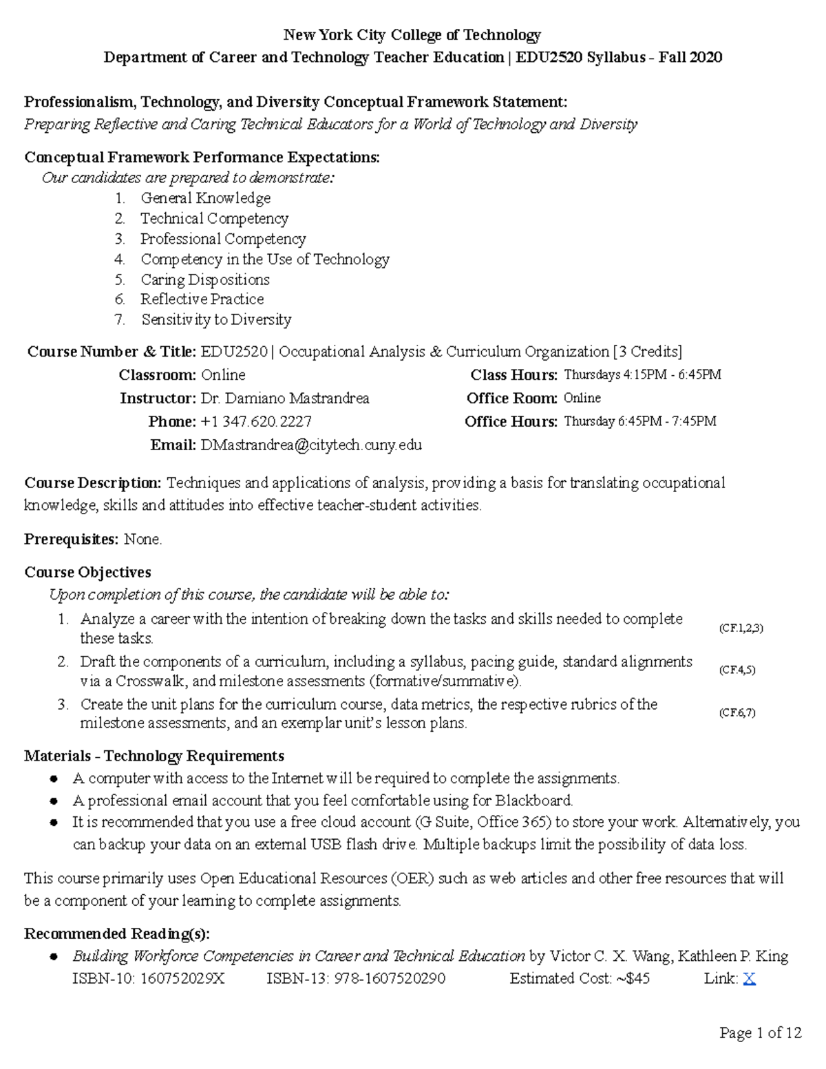 Nycct EDU2520 Course Syllabus Mastrandrea (Fall 2020) Department of
