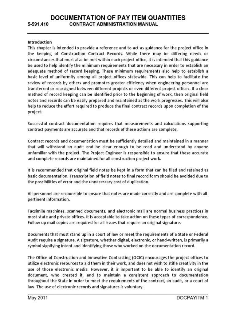 Documentation of Pay Item Quantities 5591.410 Contract Administration