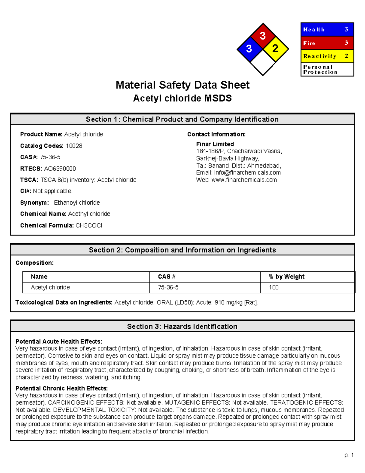 Acetyl chloride 3 3 2 He a lt h Fire Re a c t iv it y P e rs o n a l