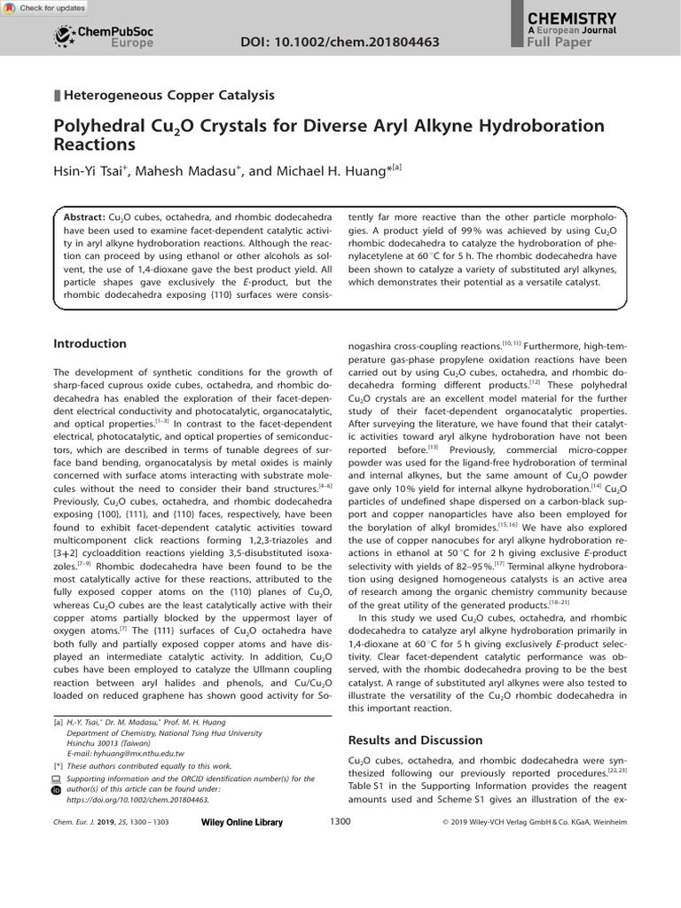 Chemistry A European J 2018 Tsai Polyhedral Cu2O Crystals For