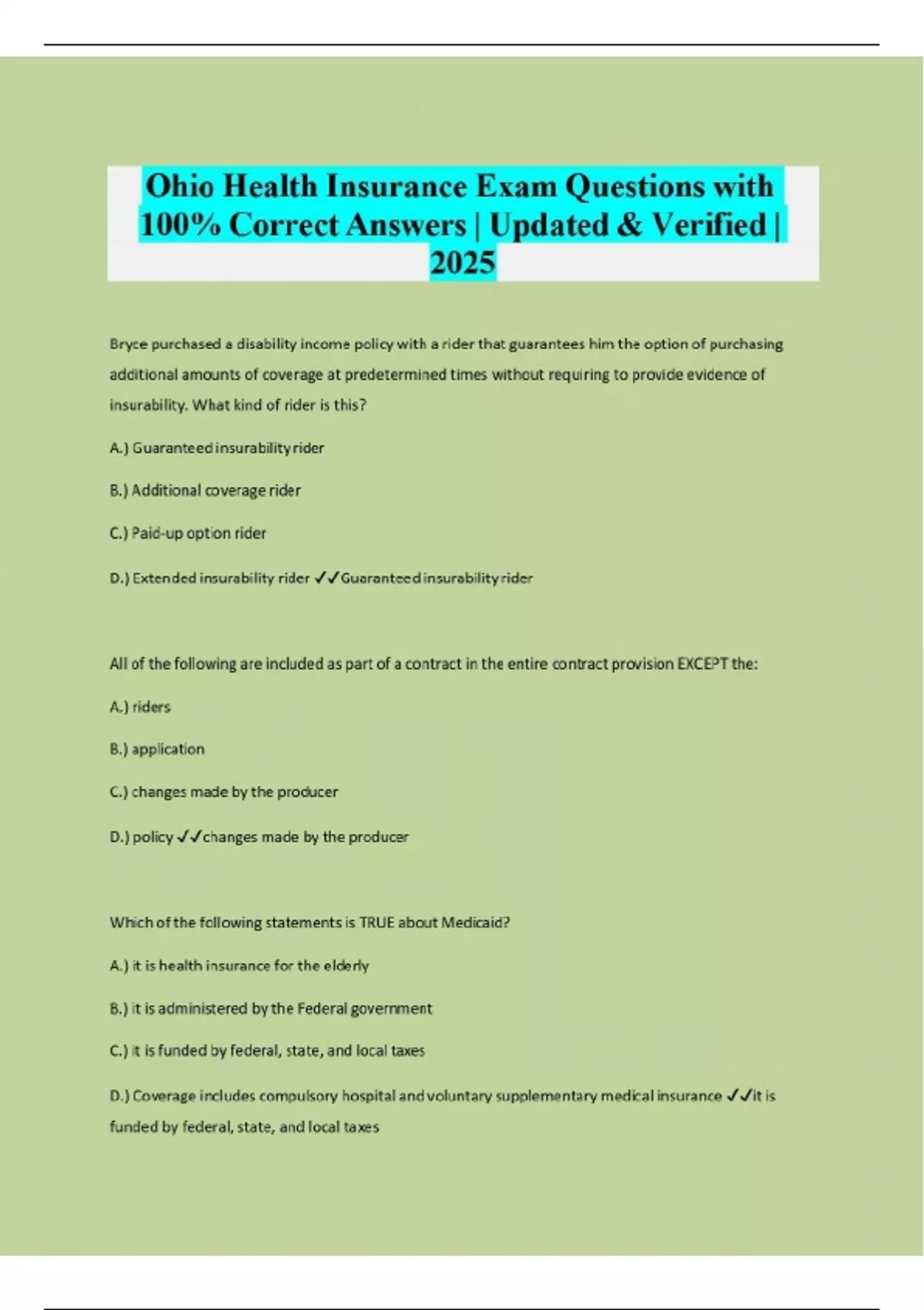 Ohio Health Insurance Exam Questions with 100 Correct Answers