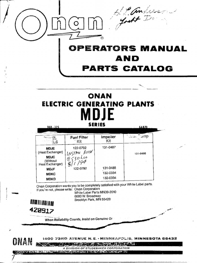 Onan MDJE Operators Manual and Parts Catalog PDF