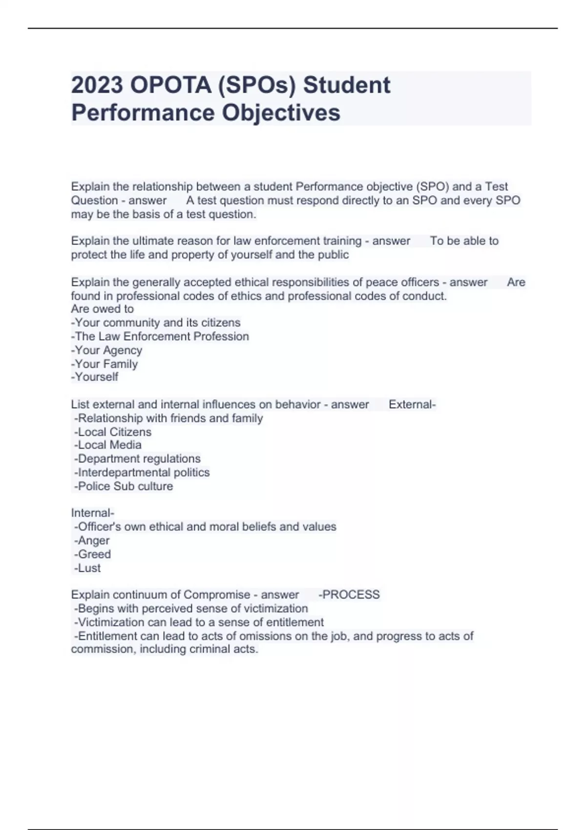 OPOTA (SPOs) Student Performance Objectives. Exam Questions And Answers