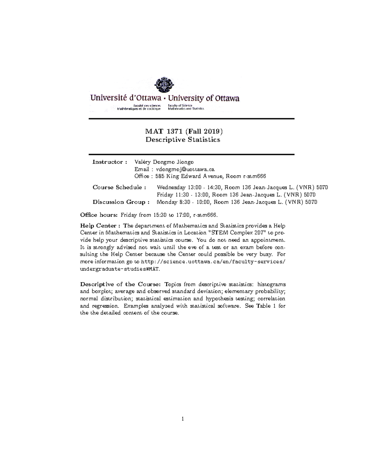 MAT 1371 A (Fall 2019 ) Course Outline by Prof Valery Dongmo Jiongo