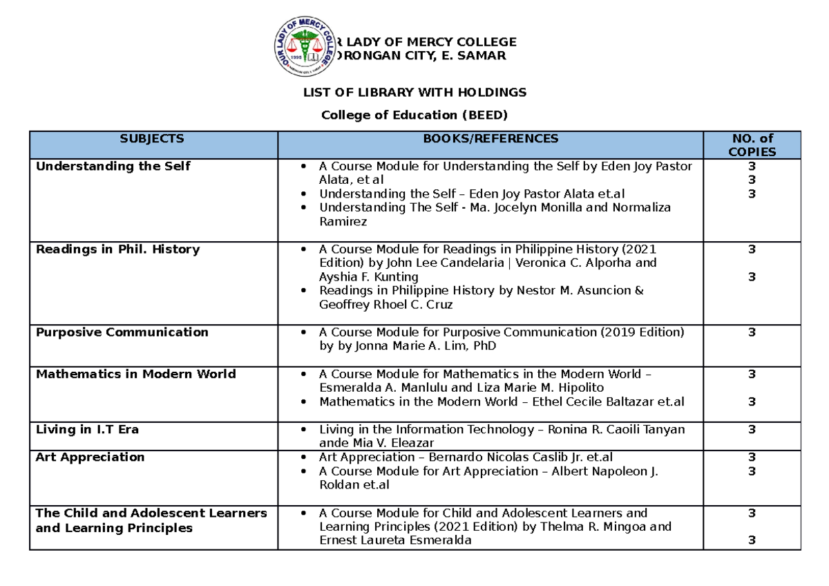 Library holdings NOTES OUR LADY OF MERCY COLLEGE BORONGAN CITY, E