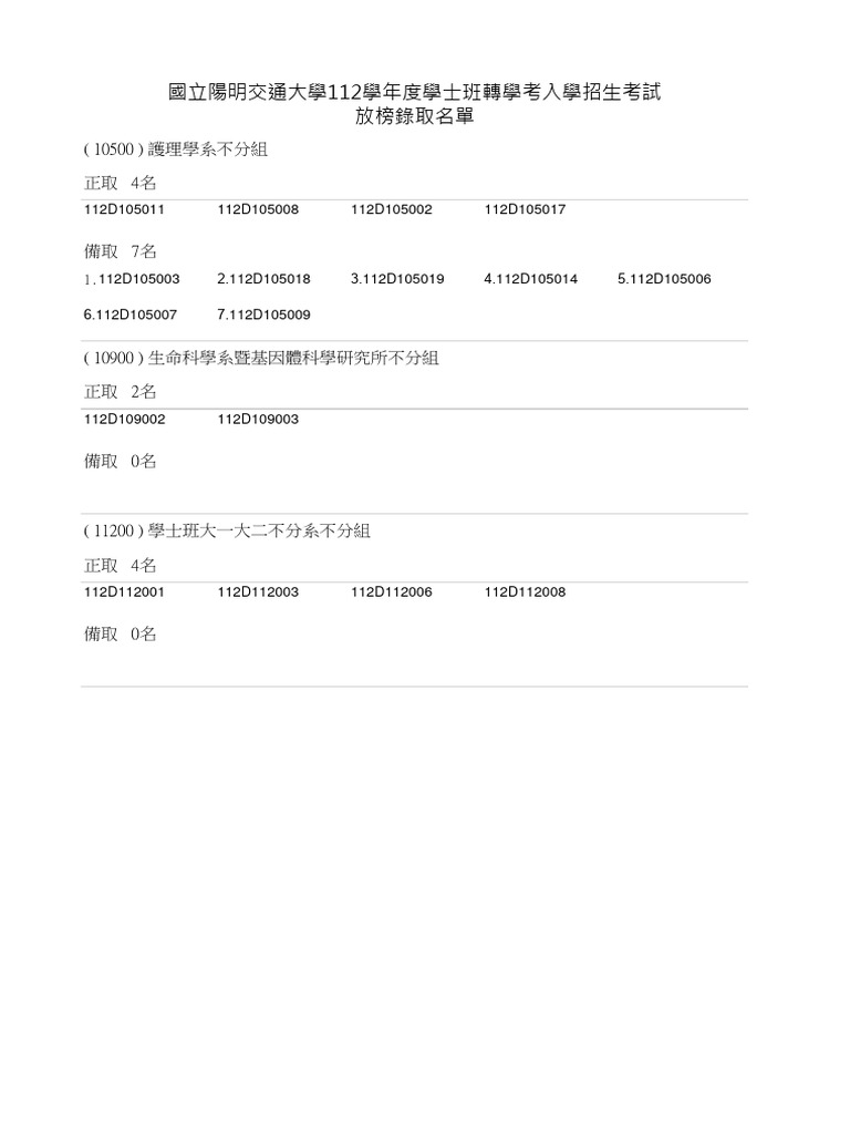 112D放榜錄取名單 無名字公告版 PDF