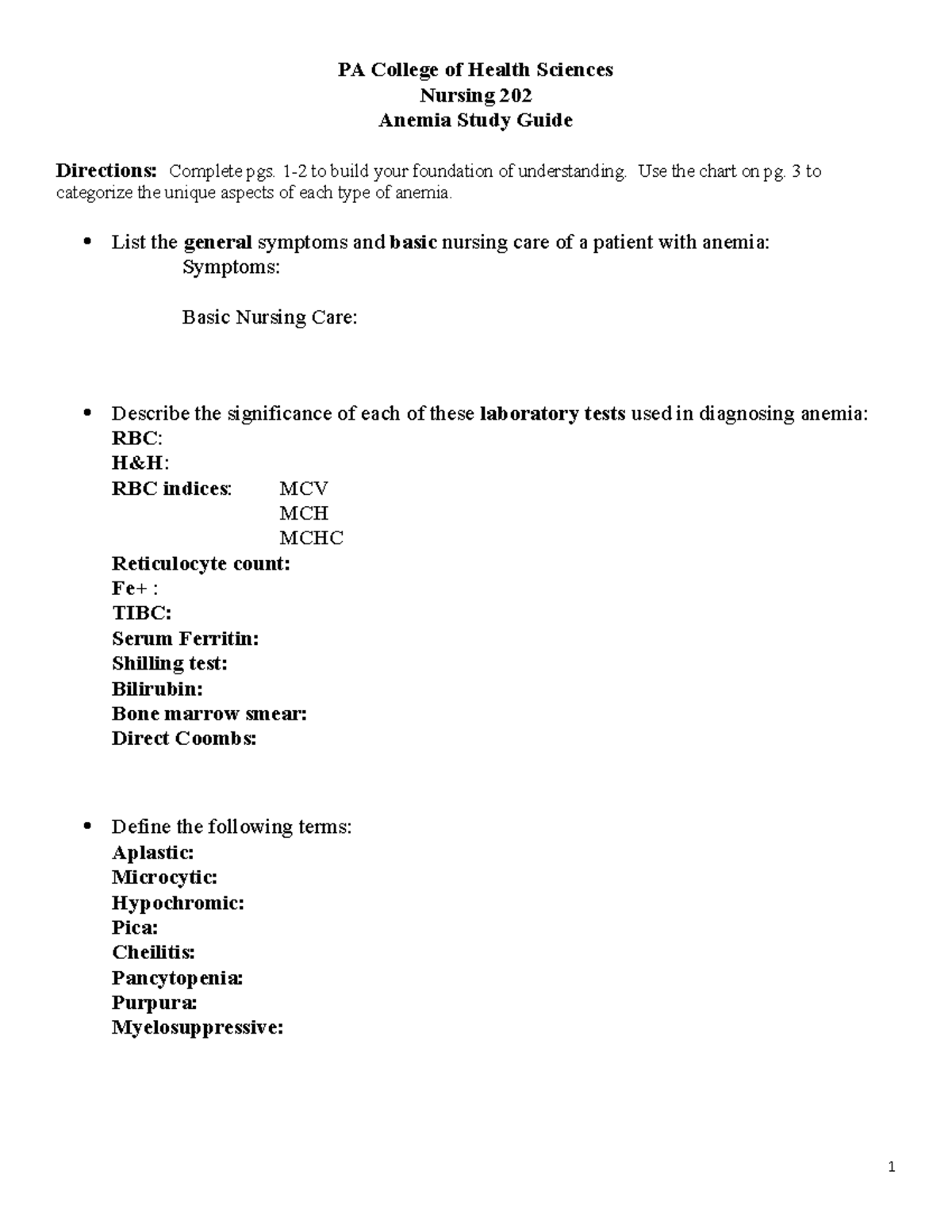 Class Prep Anemia Study Guide PA College of Health Sciences Nursing