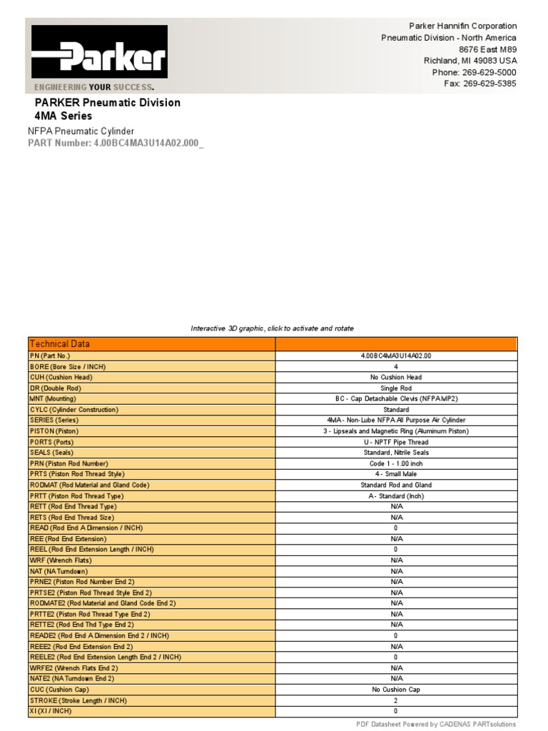 Parker 2.00J4MADU14A06.00 4MA Series Pneumatic Cylinder 250PSI IMS Supply