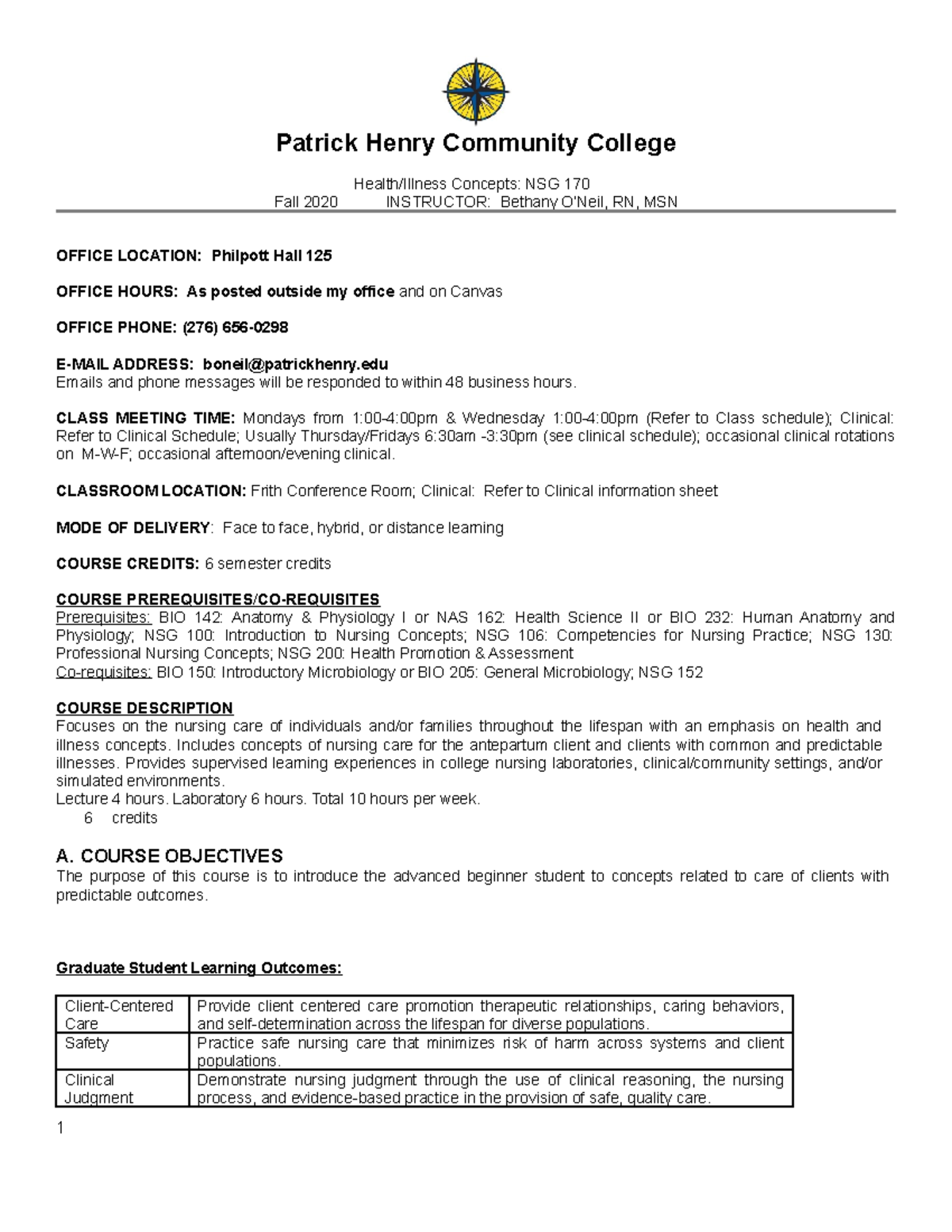 Fall2020 NSG 170 Syllabus Patrick Henry Community College Health