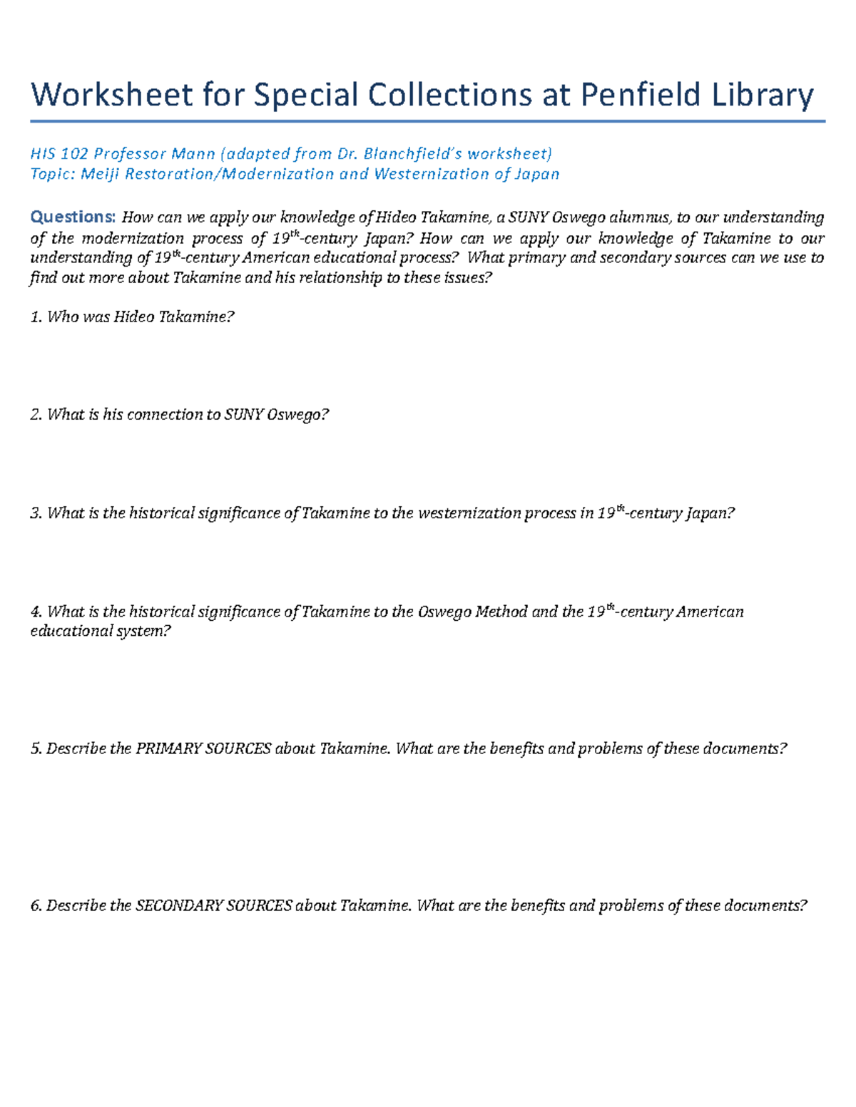 Takamine worksheet HIS 102 Worksheet for Special Collections at