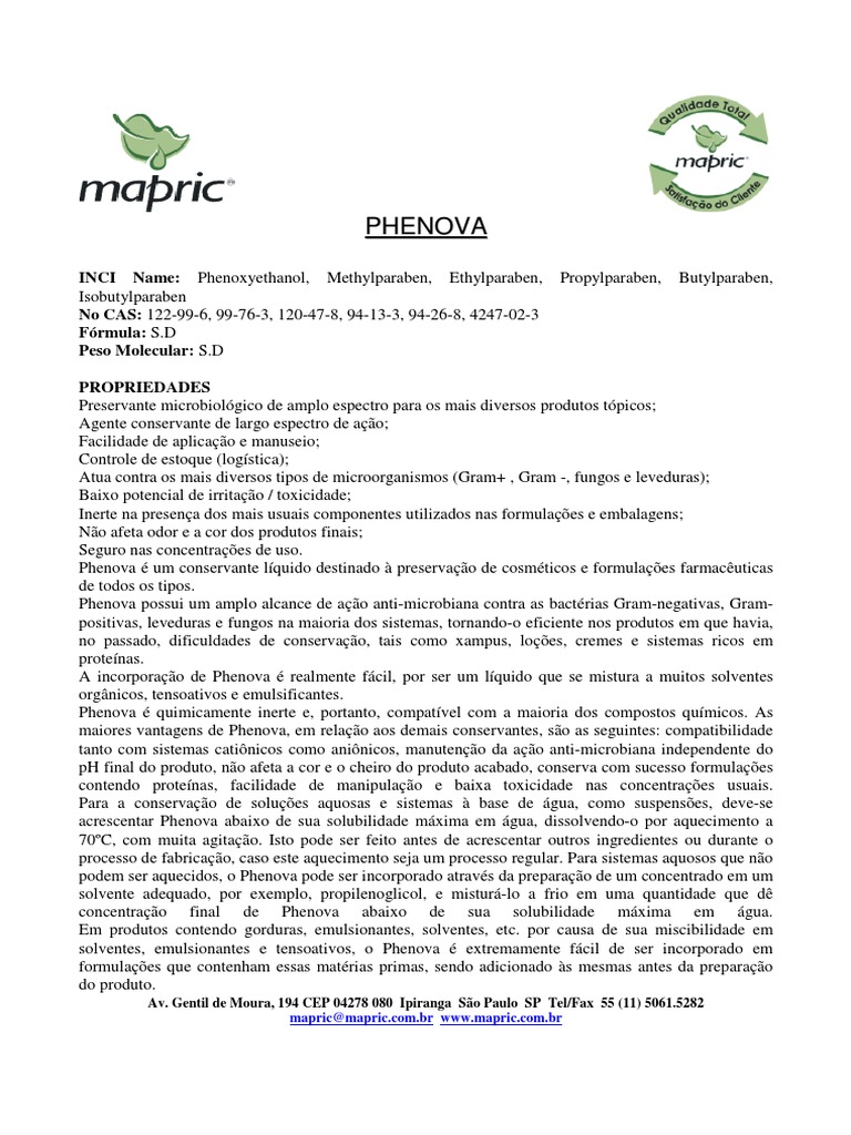 Conservante Phenova para Cosméticos PDF Emulsão Solubilidade