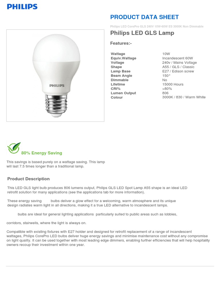 Philips LED GLS Lamp Product Data Sheet PDF Incandescent Light