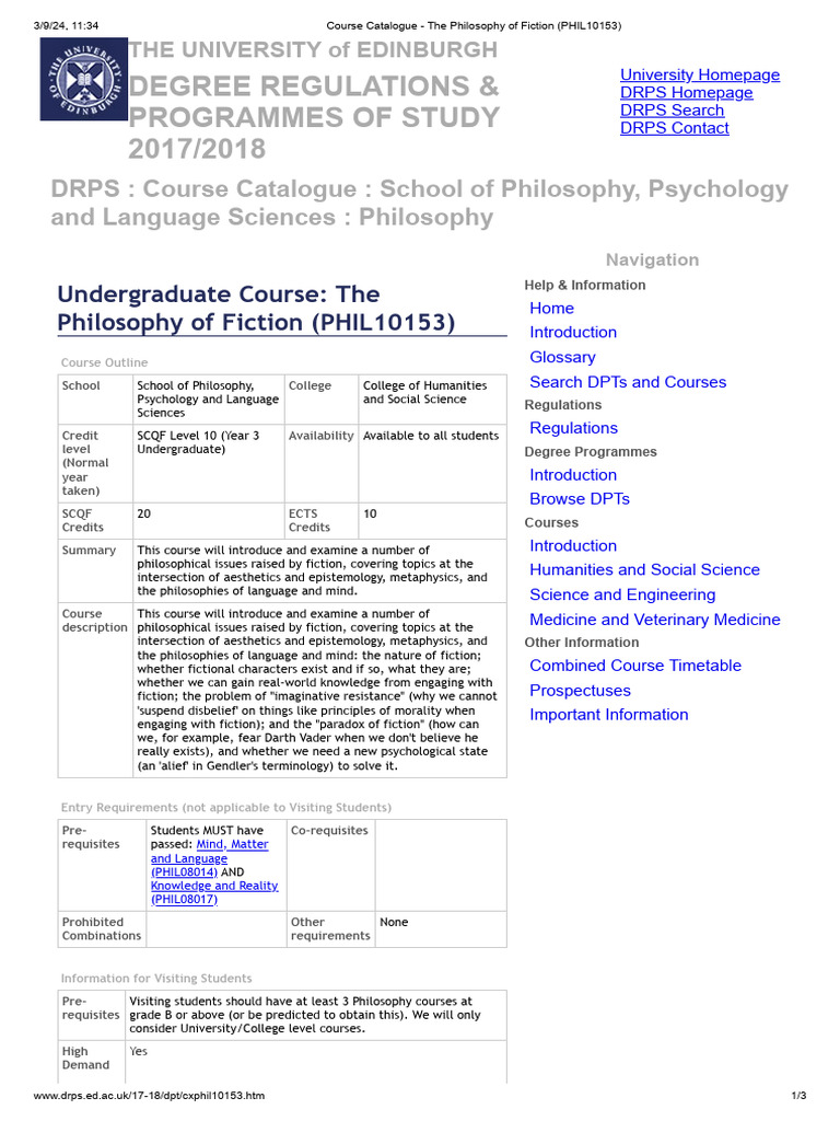 Course Catalogue The Philosophy of Fiction (PHIL10153) Edinburgh