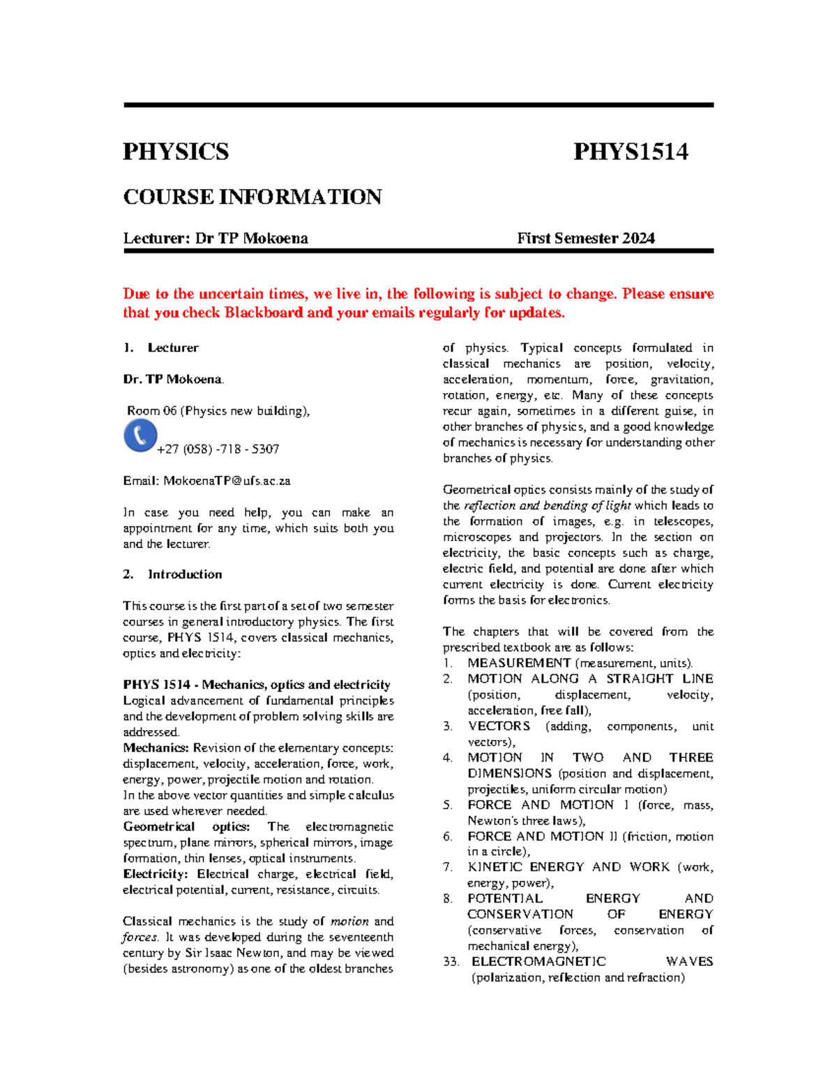 12022024 PHYS15114Course information PHYSICS PHYS COURSE INFORMATION