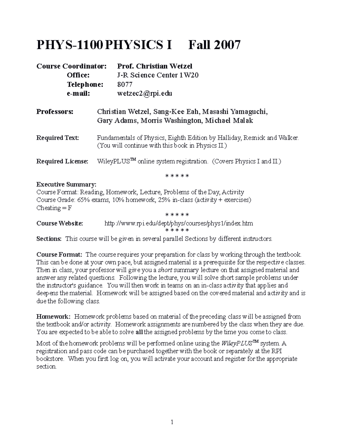 Phys1fall07syl Course syllabus PHYS1100 PHYSICS I Fall 2007