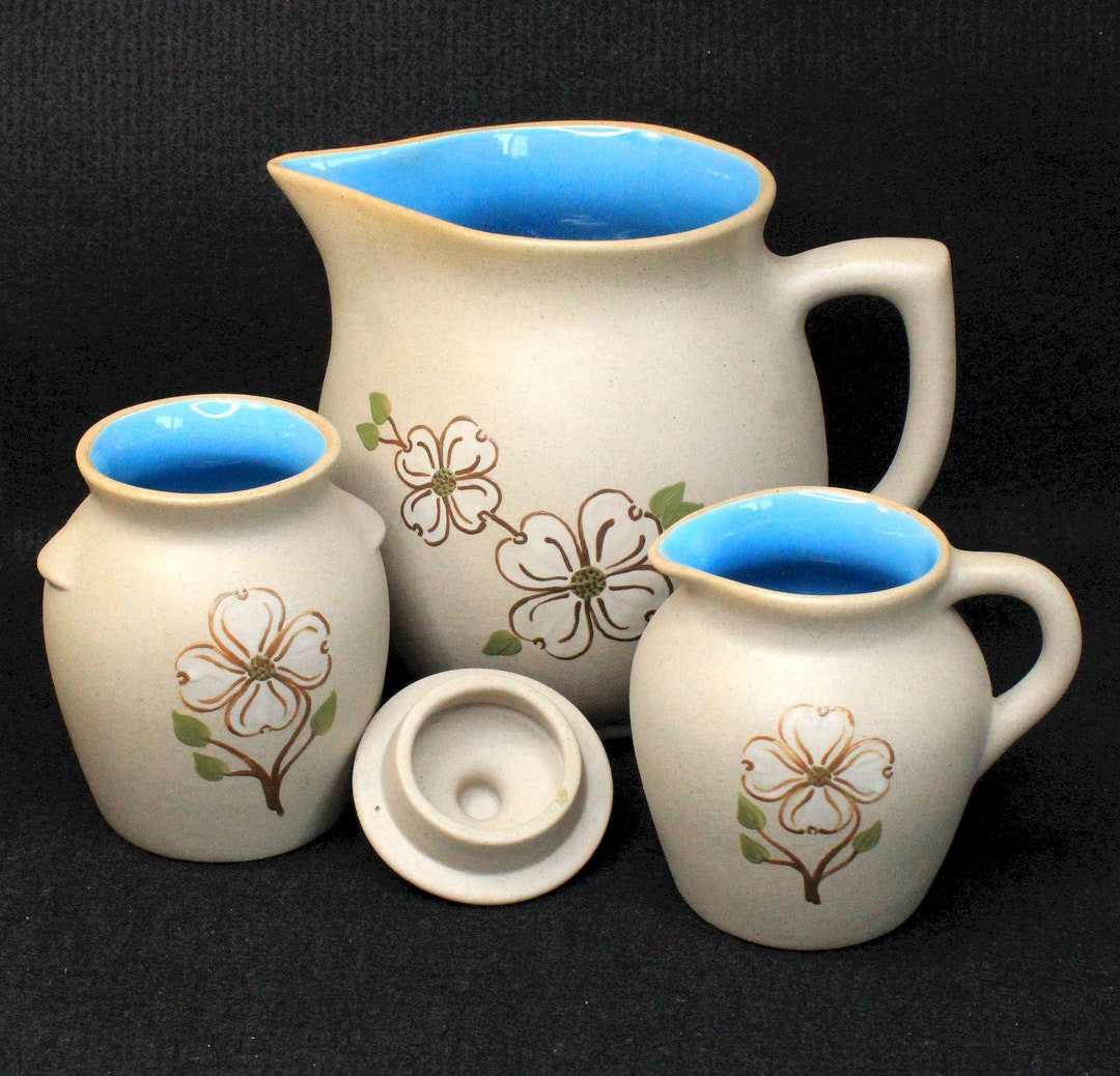 Pigeon Pottery Dogwood Pitcher and Four Cups Handmade Set