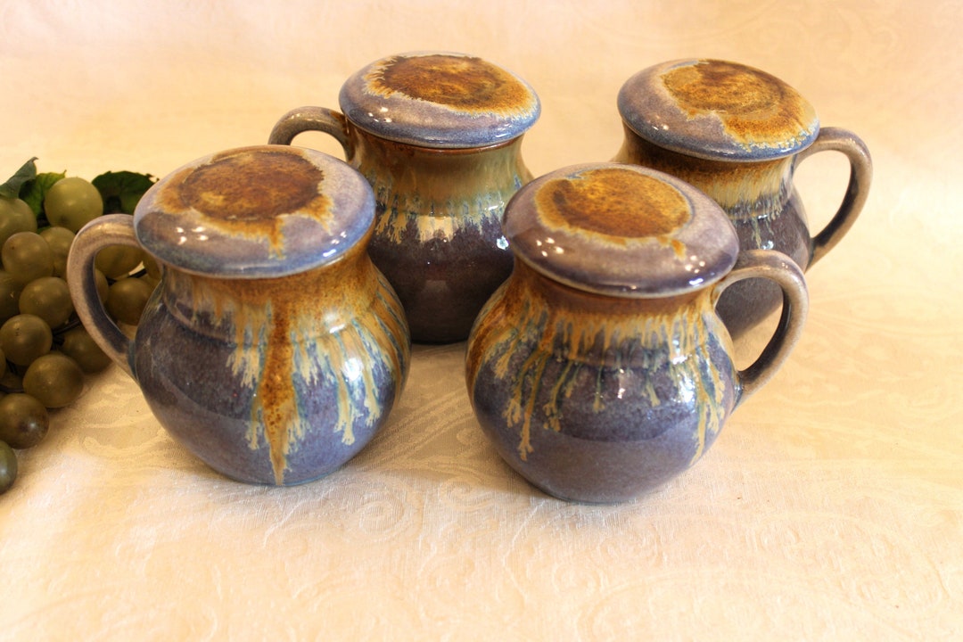 Pigeon Pottery Set of 4 Coffee or Tea Mugs With Lids Blue