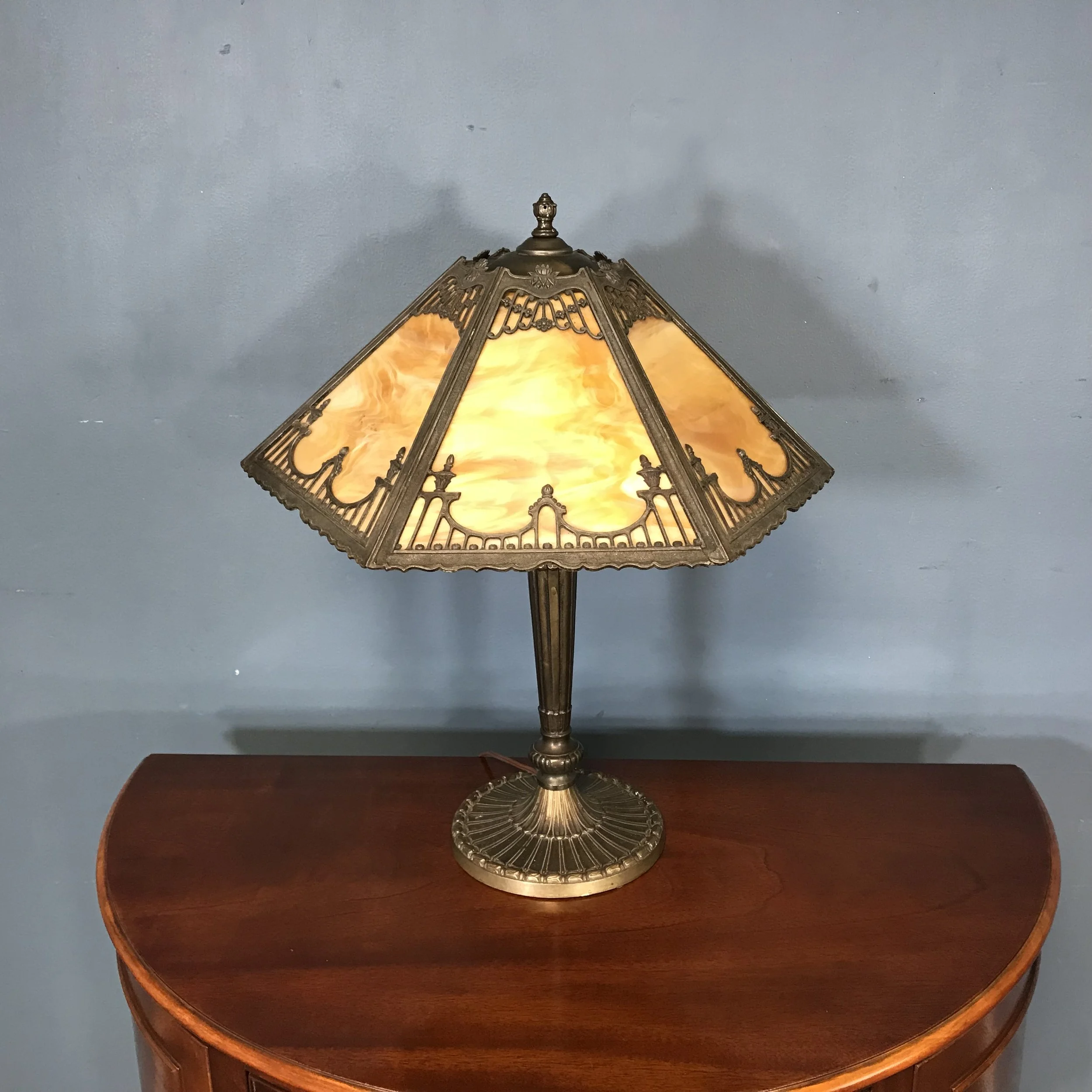 Lot REVERSE PAINTED LAMP Pittsburgh Lamp Co, circa 1915, patinated