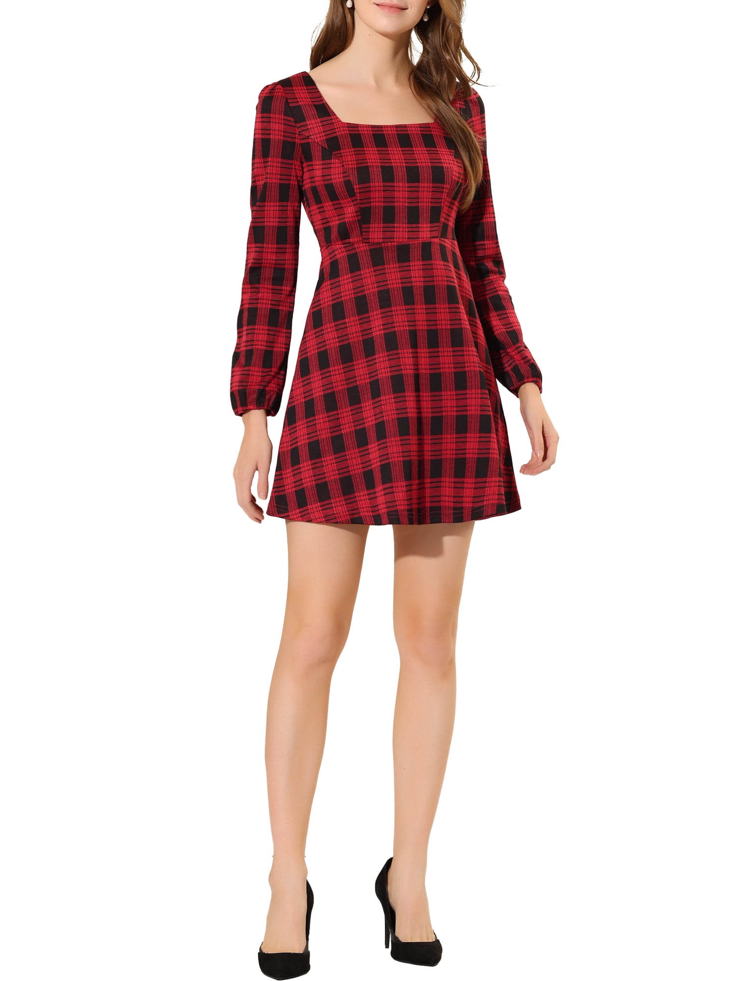 INSPIRE CHIC Women's Fall Square Neck Long Sleeves aLine Plaids Dress