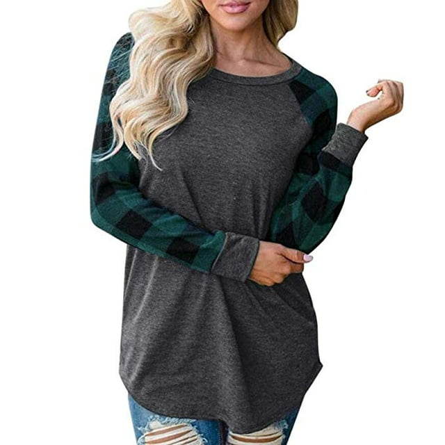 Womens Raglan Shirts Long Sleeve Crew Neck Plaid Sweatshirts Fall Tunic