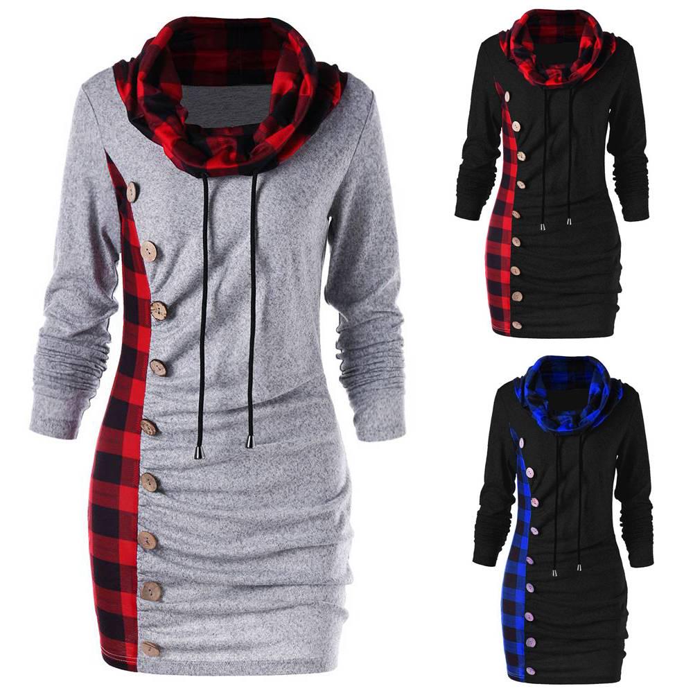 Women's Button Plaids Embellished Loose Sweatshirt Dress High Neck