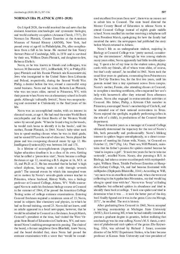(PDF) Norman Ira Platnick (19512020) Lorenzo Prendini Academia.edu
