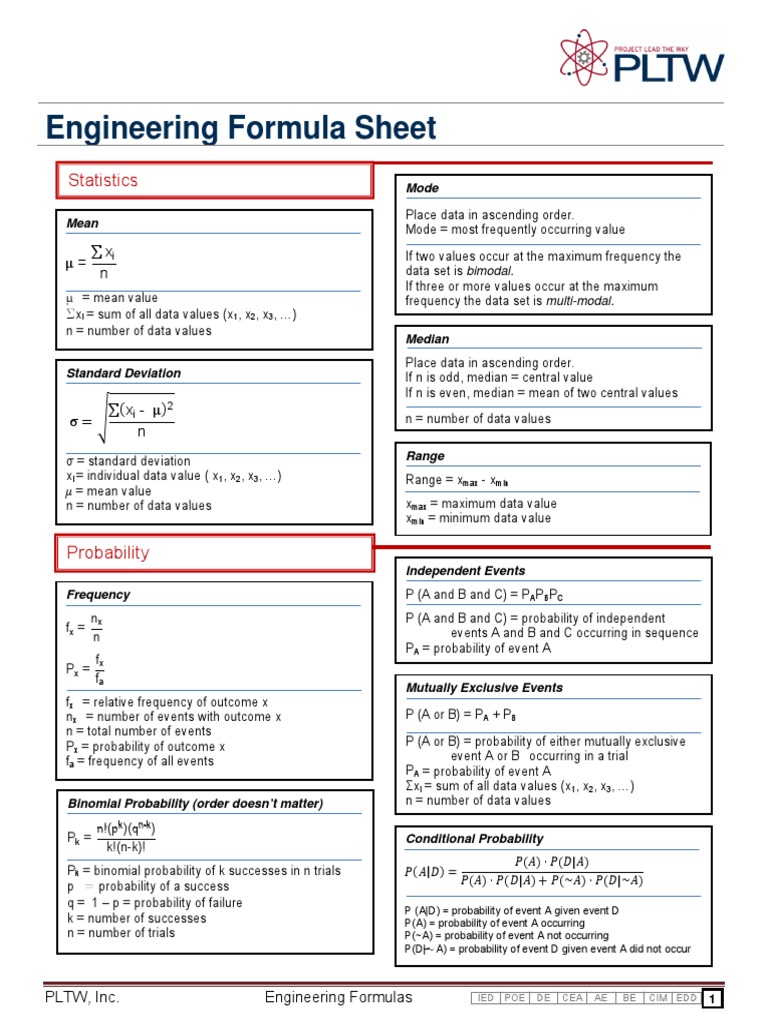 PLTW Engineering Formula Sheets PDF Area Orbit