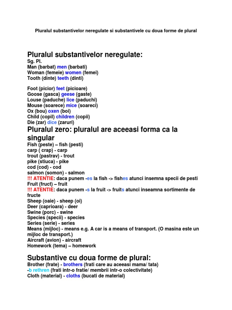 Pluralul Substantivelor Neregulate Si Substantivele Cu Doua Forme de