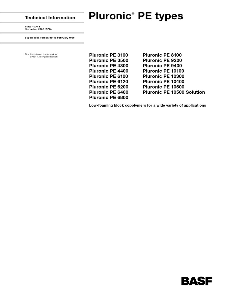 PLURONIC PE Types BASF PDF Detergent Solubility