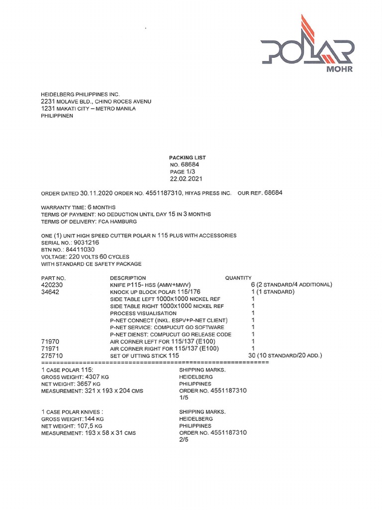 Packing List PO 4551187310 HS Polar Cutter N115 Hiyas PDF