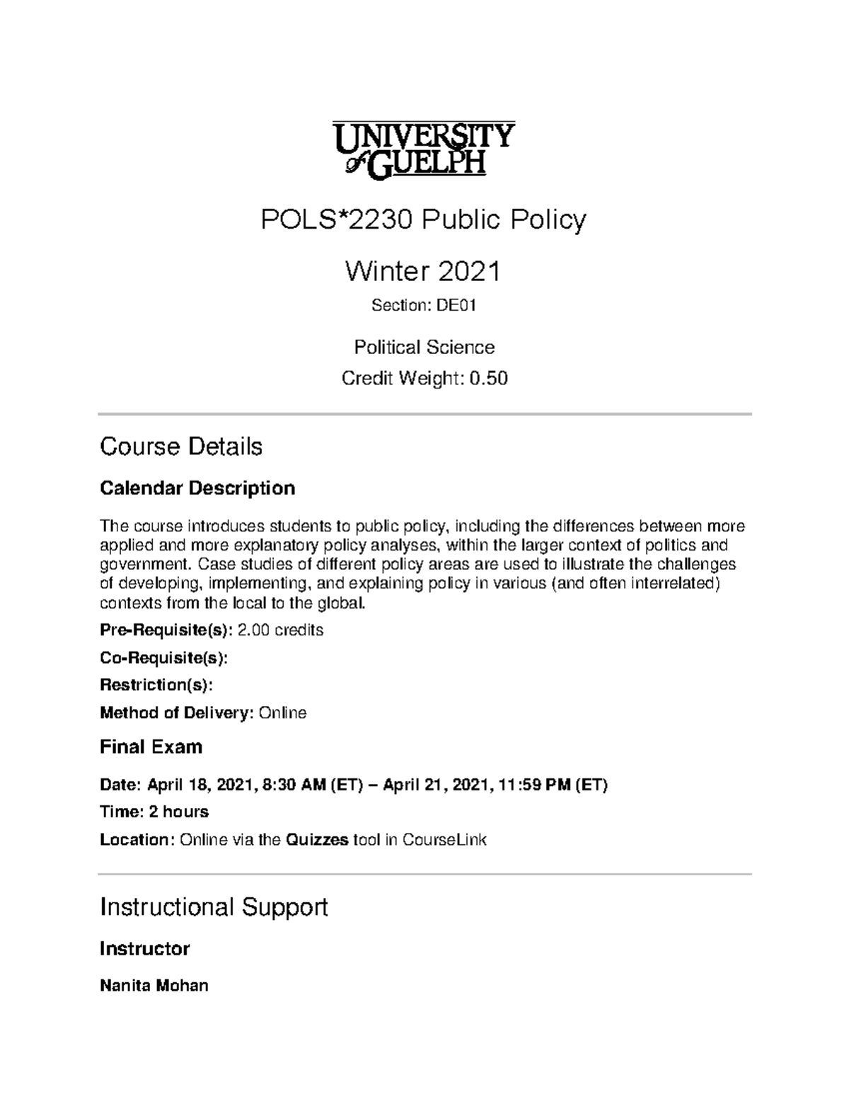 POLS2230 Course Outline W21 Final POLS*2230 Public Policy Winter 2021