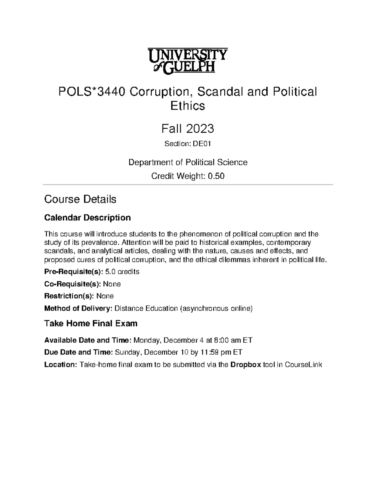 Outline POLS 3440 POLS*3440 Corruption, Scandal and Political Ethics