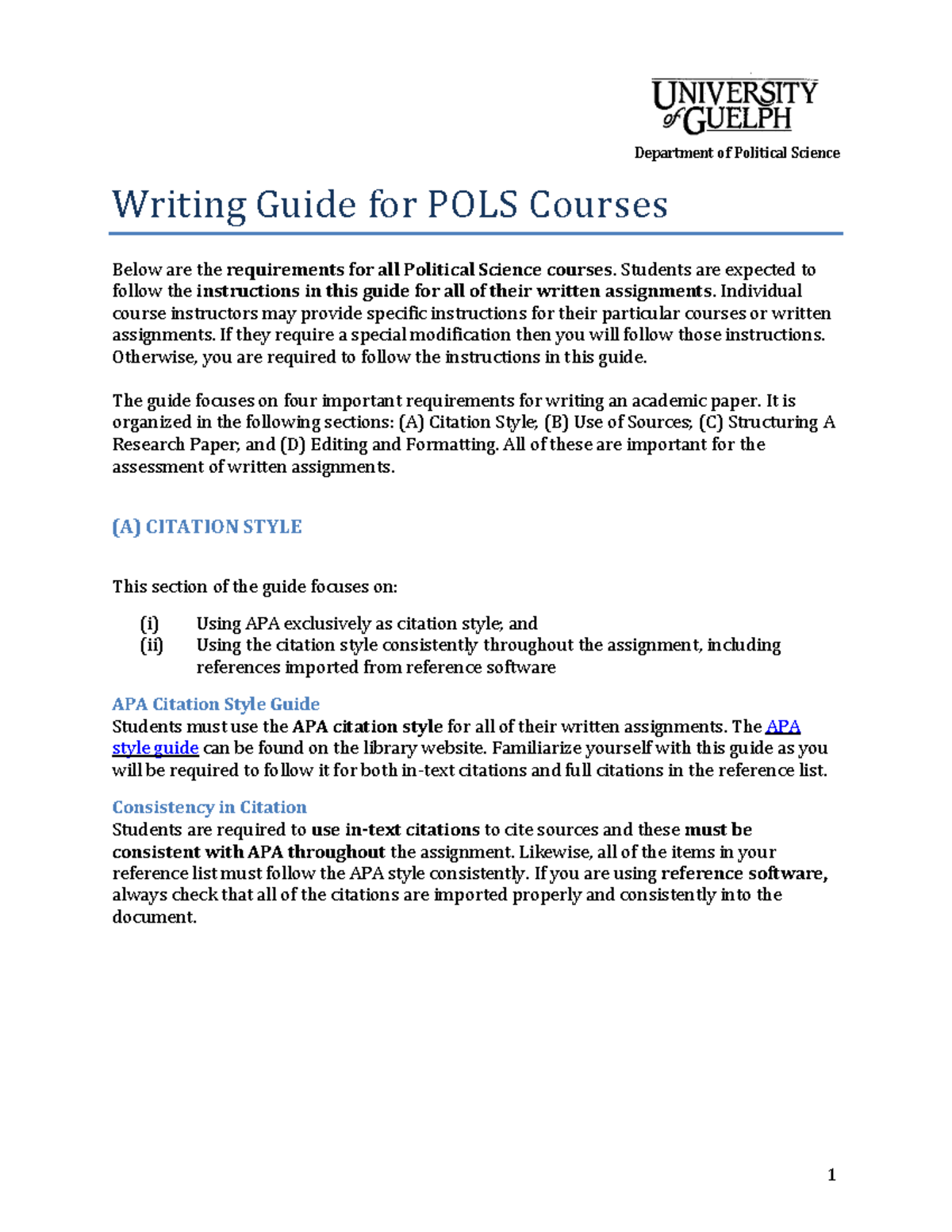 Department of Political Science Writing Guide 2020 Writing Guide for