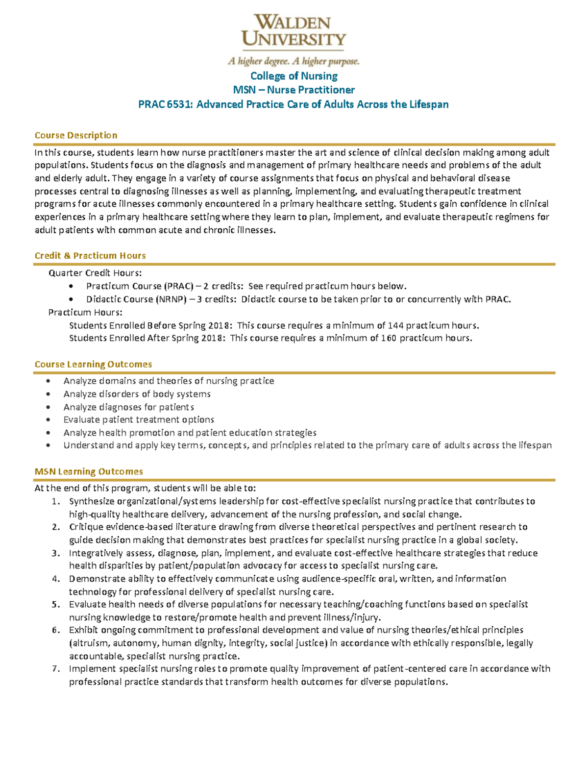 6531 PRAC Course Overview College of Nursing MSN Nurse