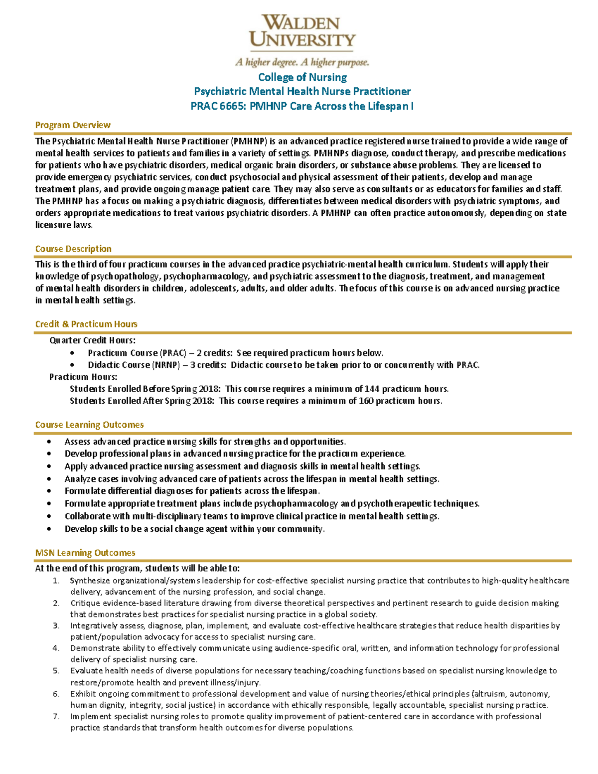 6665 PRAC Course Overview College of Nursing Psychiatric Mental