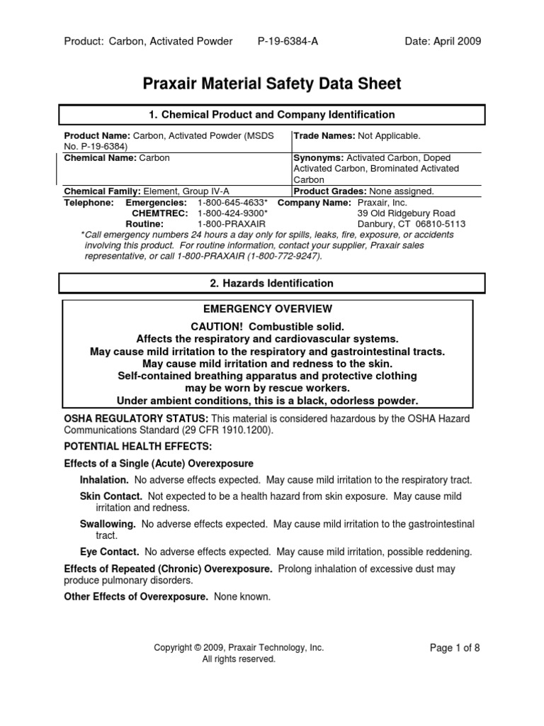 Praxair Material Safety Data Sheet Product Carbon, Activated Powder P