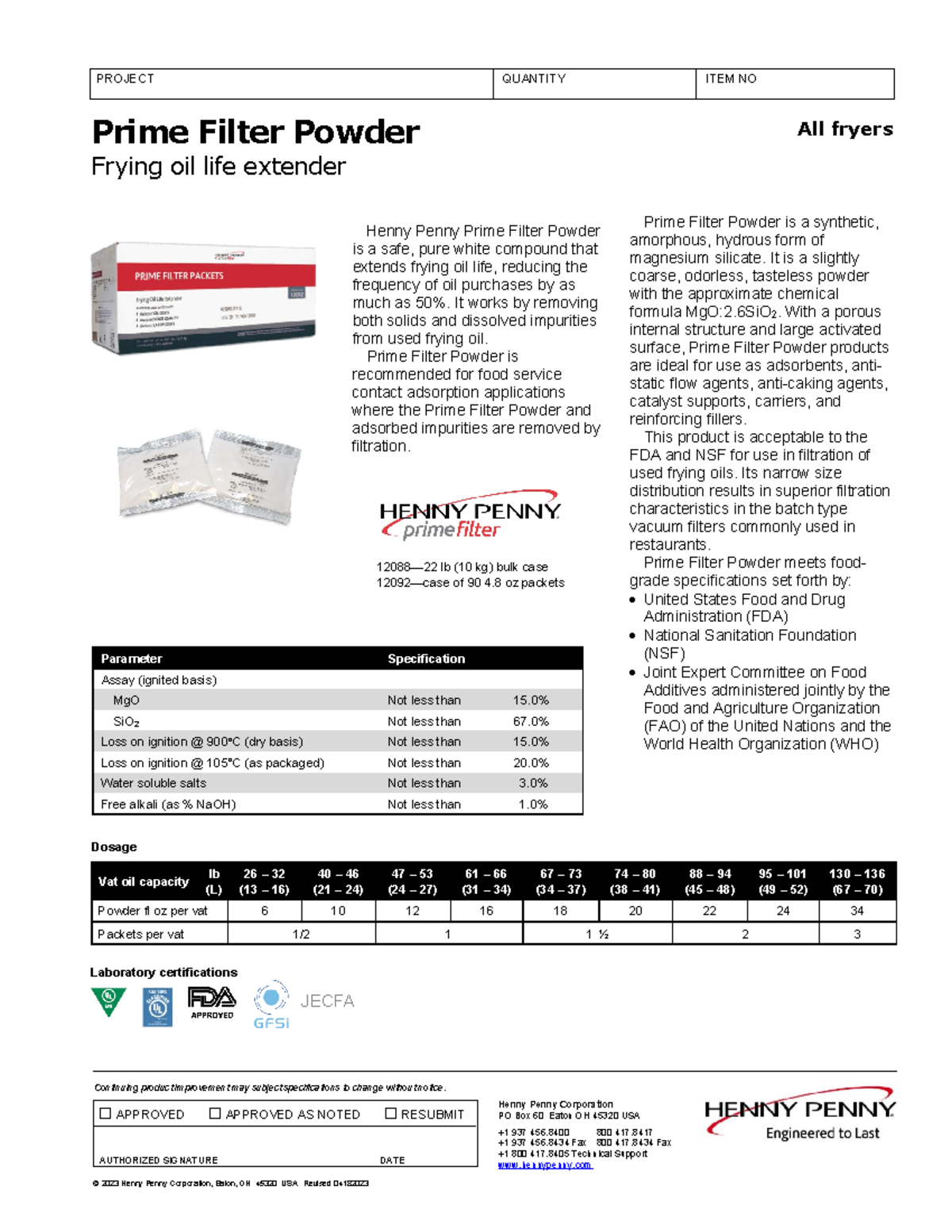 Prime Filter Powder data sheet All fryers © 20 23 Henny Penny